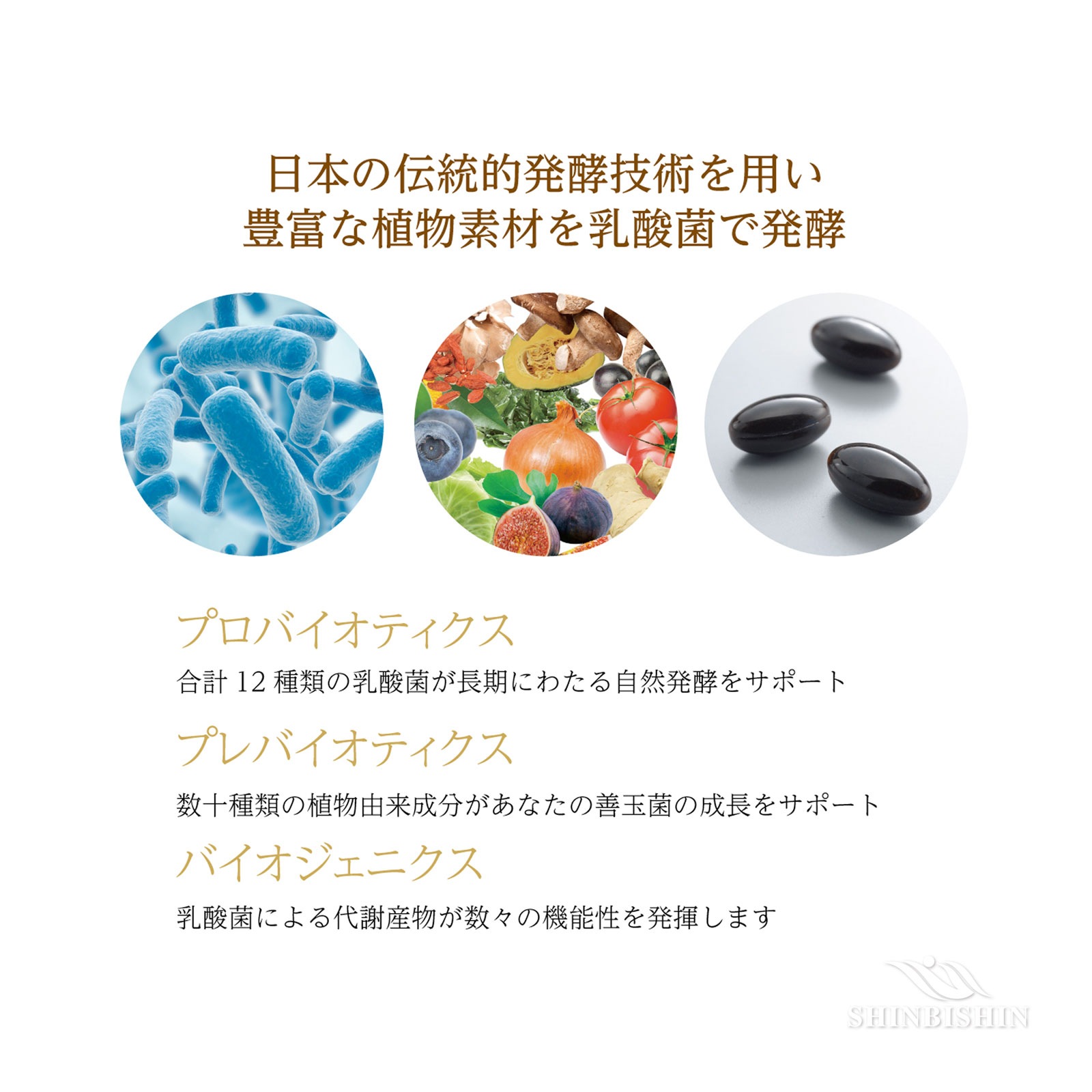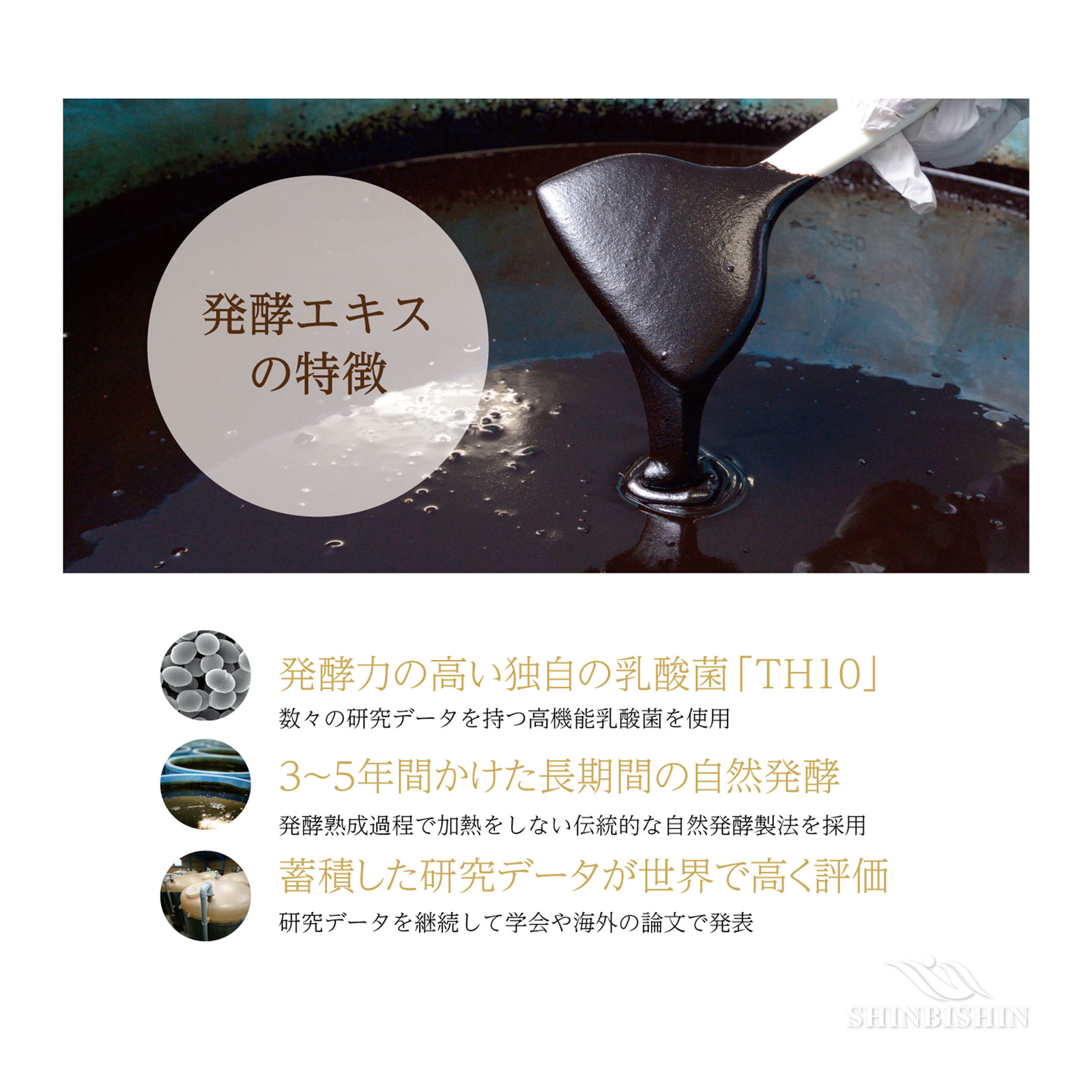 東南アジアの伝統的発酵食品から分離・同定したプロバイオティクス乳酸菌TH10を利用し、発酵・熟成を経ました。植物性・動物性乳酸菌を180種類以上の乳酸菌から厳選。あなたのお腹に住んでいる、あなたにピッタリの乳酸菌を増やします。また、植物原料を発酵させ、カラダが吸収しやすい形に分解しています。