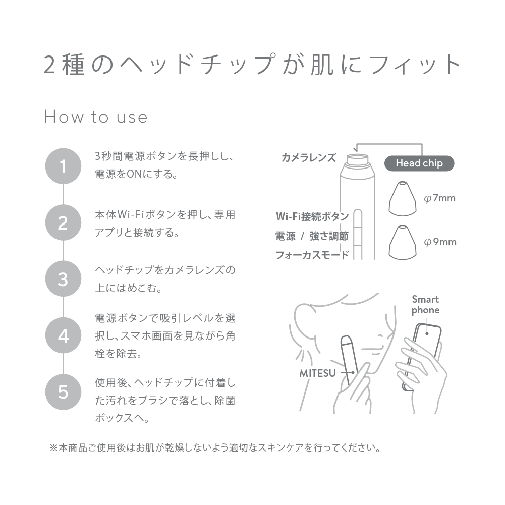 KEANA SUCTION MITESUなら、シリコン製のヘッドチップで優しく吸引、アプリケーションを使用した高画質300万画素カメラでの毛穴の目視により、しっかりと角栓ケアを行うことが可能です。