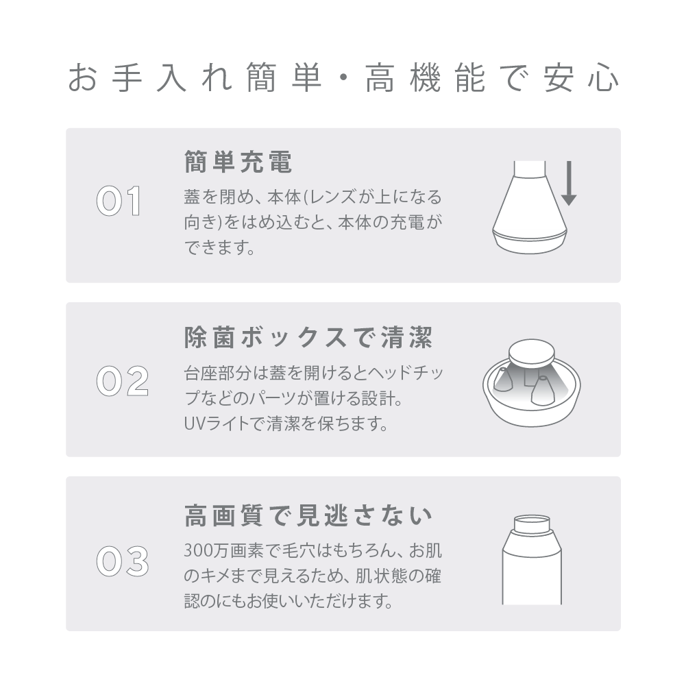 03.高画質で見逃さない:300万画素で毛穴はもちろん、お肌のキメまで見えるため、肌状態の確認にもお使いいただけます。