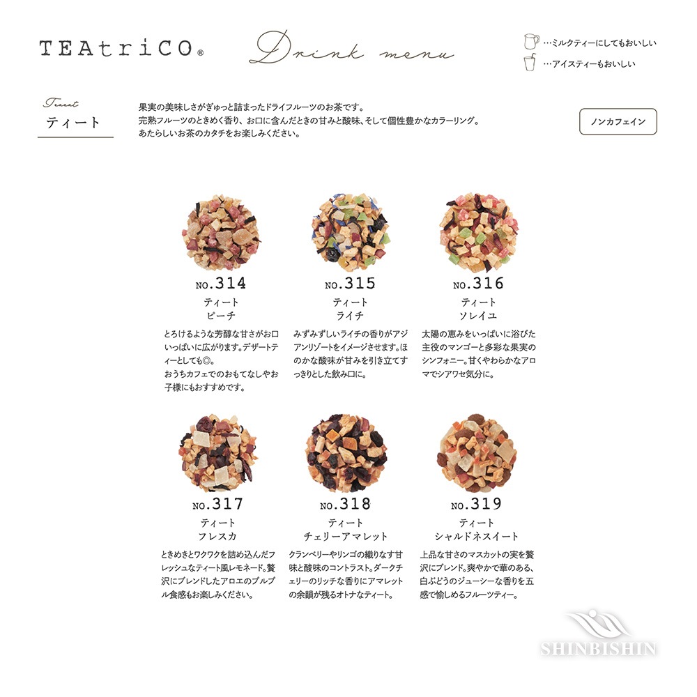 | 原材料 | 加糖ドライパパイヤ(タイ製造), 加糖ドライメロン, 加糖ドライマンゴー, 有機ドライアップル, 有機ドライアプリコット, 有機ハイビスカス, 有機マリーゴールド, 有機米粉, 香料, クエン酸, 保存料(亜硫酸塩) |